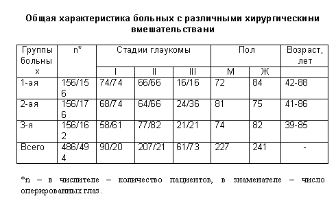 В работе представлены результаты обследования и хирургического лечения 468 пациентов (494 глаза) с ПОУГ I-III стадии. В соответствии с задачами исследования они были разделены на 3 равноценные по количественному составу (по 156 человек) и клиническому статусу группы. Пациенты 1-ой группы прооперированы по классической методике НГСЭ по Федорову-Козлову. Больным 2-ой группы была произведена разработанная нами (совместно с Балашевичем Л.И. и Науменко В.В.) операция, а 3-ей - то же вмешательство, дополненное 5-7 подконъюнктивальными инъекциями 5-фторурацила в послеоперационном периоде (см. таблицу).